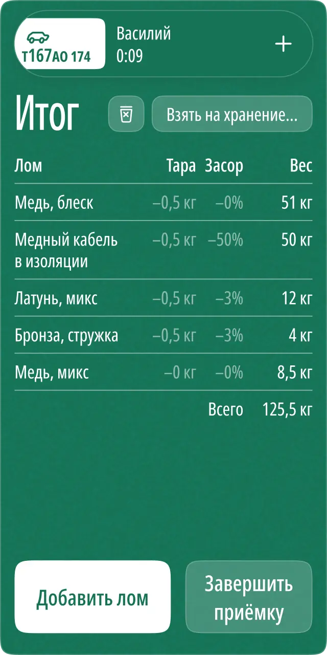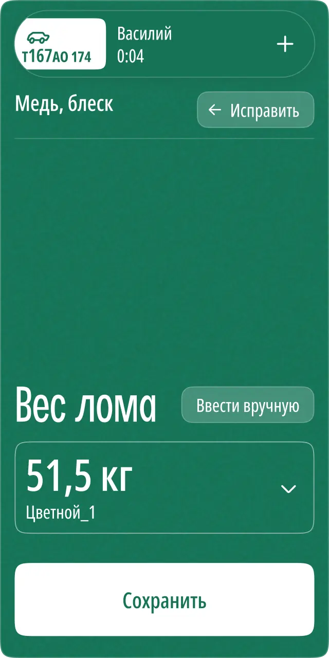Каждый лом записывается на лету, вес автоматически прилетает с весов в приложение.