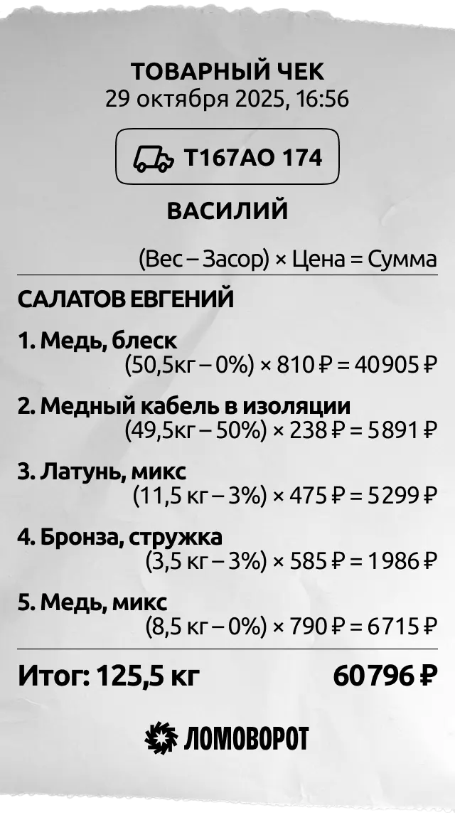 Ломоворот принимает любой лом и знает про процентовки. Приёмщикам незачем доставать блокнот