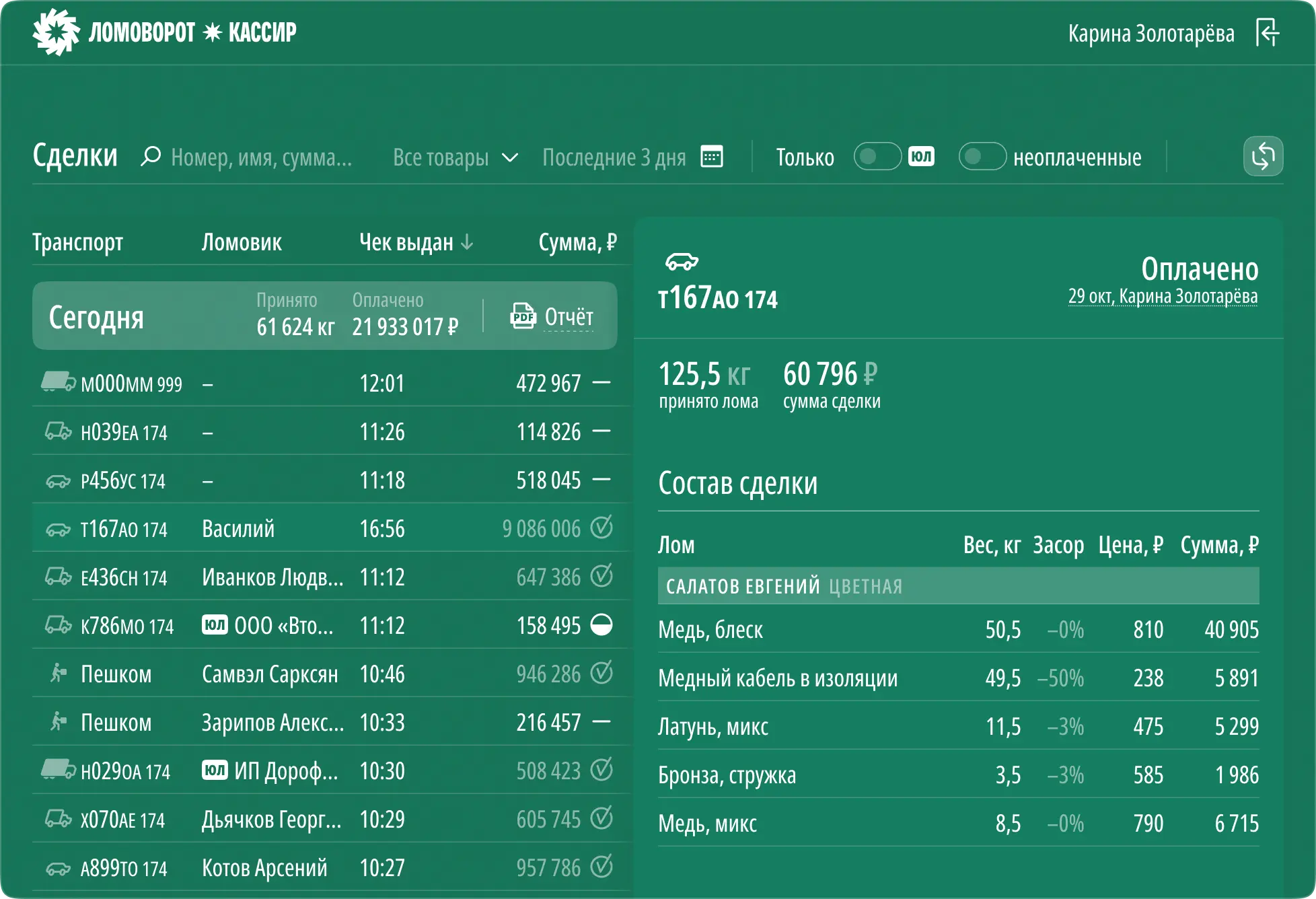 Каждый лом записывается на лету, вес автоматически прилетает с весов в приложение.